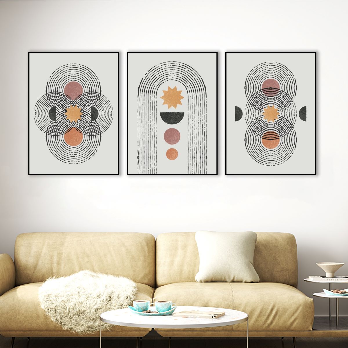 Elevate your home décor with our Abstract Geometric Rolled Canvas Print Set. This stunning set of 3 canvas prints brings the beauty and sophistication of abstract art into your space. Each canvas showcases a detailed and artistic depiction of circular and semi-circular patterns in various colors, including black, orange, and pink. The minimalist yet vibrant design creates a calming and sophisticated atmosphere, perfect for enhancing the aesthetic appeal of any room.