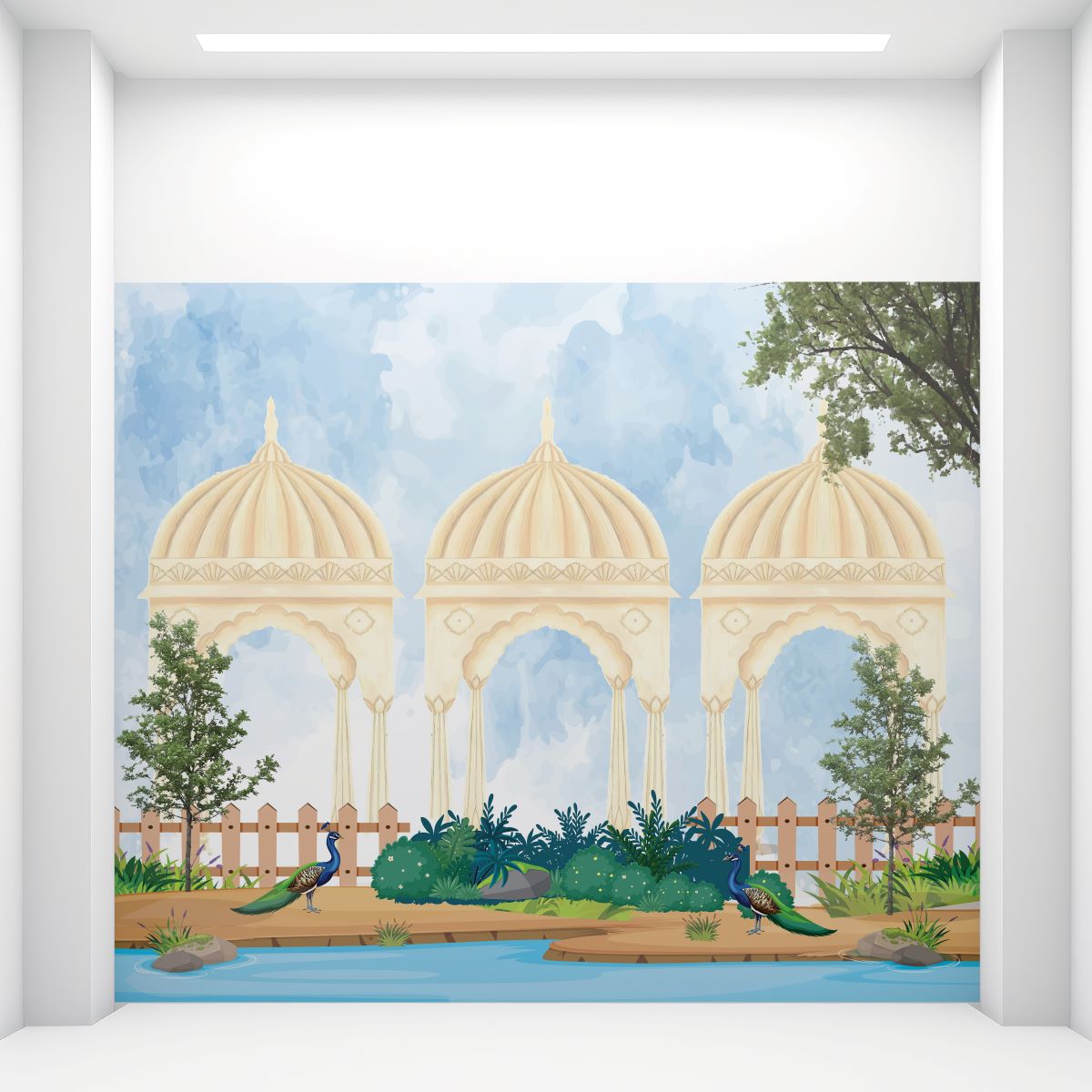 Elevate your interiors with our Serene Garden and Peacock UV Digital Printed Self-Adhesive Wallpaper. This exquisite wallpaper showcases a tranquil garden setting framed by traditional Indian architecture. The scene features three ornate domed structures in the background, crafted with intricate details that reflect the elegance of traditional design.
