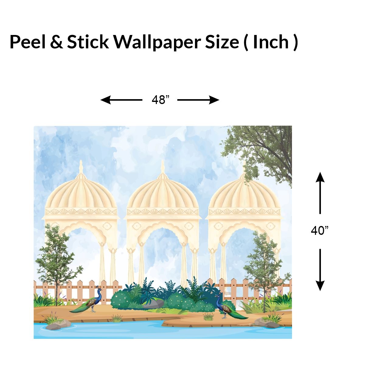 Transform your space with our UV digital printed self-adhesive wallpaper. Featuring a serene garden scene with ornate domed structures and two graceful peacocks, this peel-and-stick wallpaper adds traditional elegance and natural beauty to any room. Easy to apply and remove, perfect for a quick décor refresh.