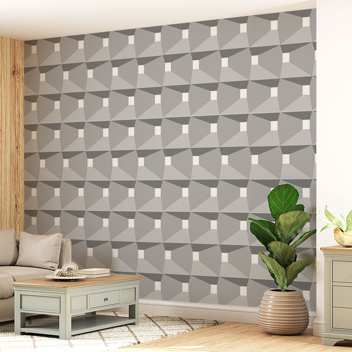 The interplay of light and dark shades within the trapezoids enhances the sense of depth and dimension, making the pattern appear to pop off the flat surface. This intricate design adds a contemporary and dynamic element to your decor, perfect for creating a feature wall or adding a touch of modern sophistication to any room.